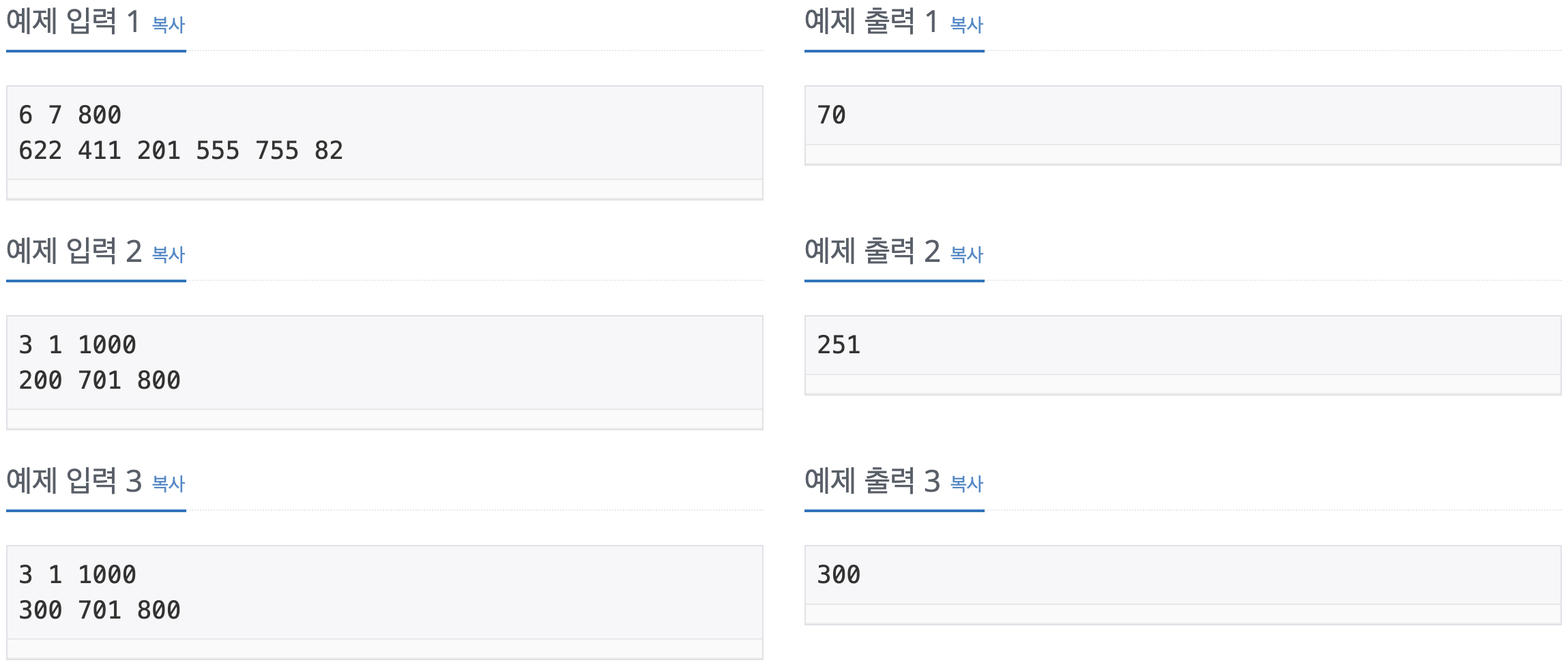 6. 이런 식으로 0, 300, 701, 800, 1000까지 탐색하고, 만약 m개 이상 휴게소를 설치해야 한다면 false를 리턴, m개 이하로 가능하다면 true를 리턴하면 된다.