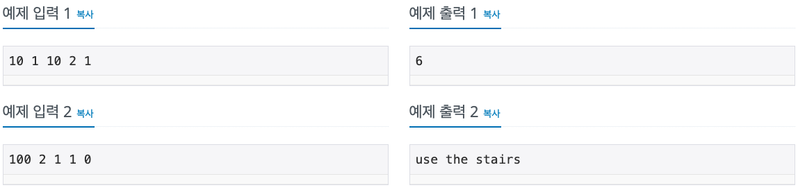 첫째 줄에 강호가 S층에서 G층으로 가기 위해 눌러야 하는 버튼의 수의 최솟값을 출력한다. 만약, 엘리베이터로 이동할 수 없을 때는 "use the stairs"를 출력한다.