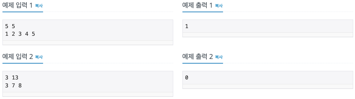 첫 번째 줄에 물건의 개수 N과 제시하는 무게 C가 공백으로 구분되어 주어진다. (1 ≤ N ≤ 5,000, 1 ≤ C ≤ 108, N과 C는 양의 정수) 다음 줄에는 N개의 물건 각각의 무게 w가 공백으로 구분되어 주어진
