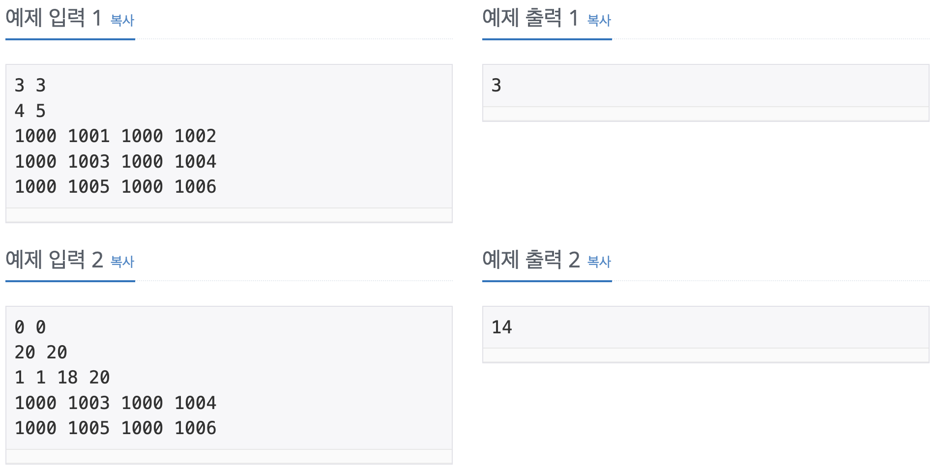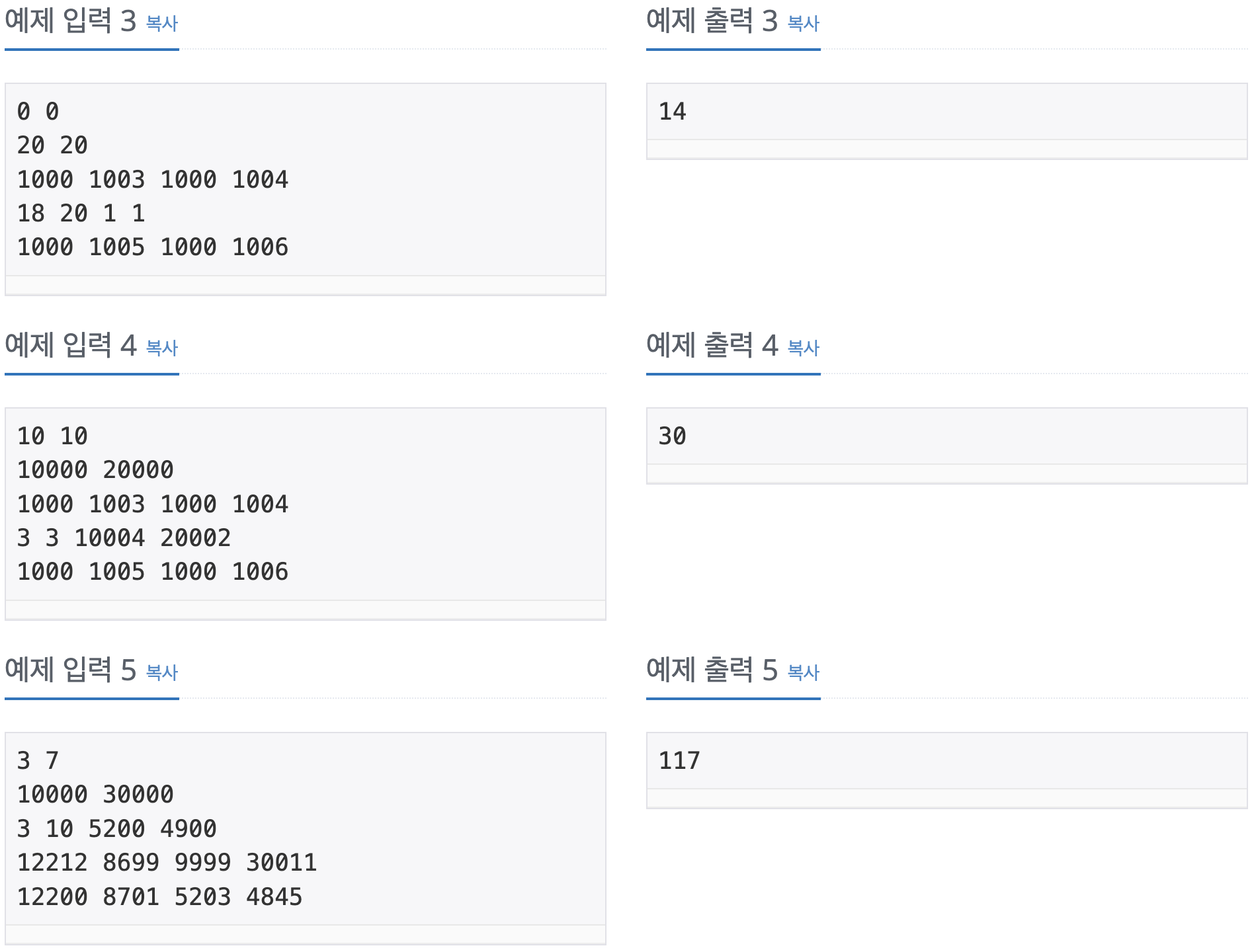 셋째 줄부터 세 개의 줄에는 텔레포트의 정보 x1, y1, x2, y2가 주어진다. (0 ≤ x1, y1, x2, y2 ≤ 1,000,000,000)
