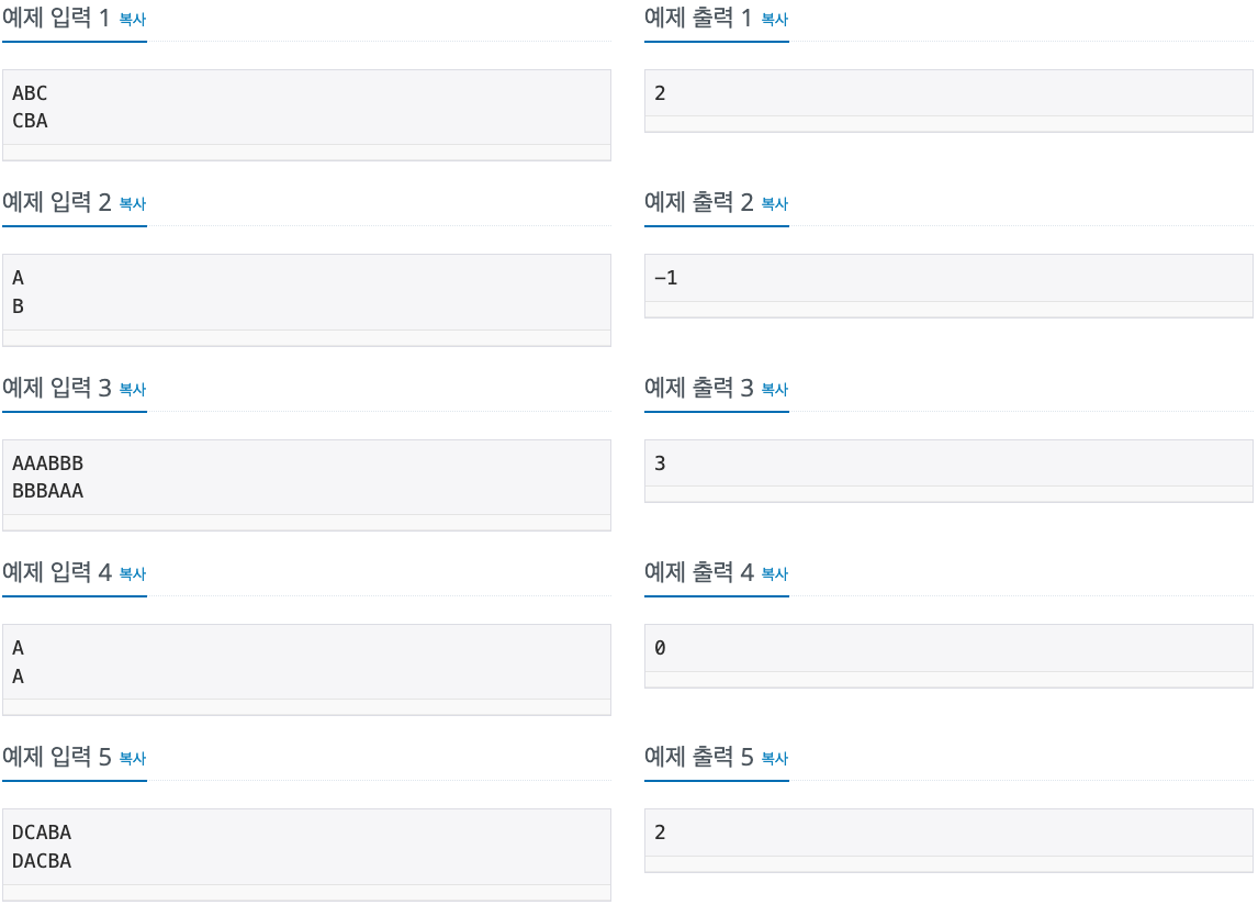우선 A와 B 문자열이 다른 경우는 -1이기 때문에 둘을 sort하고 값이 다르다면 -1을 출력하고 걸러준다.
