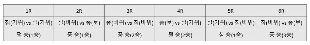 2. 비긴 경우 (같은 걸 낸 경우) 위에서 정해진 순서가 앞선 사람이 이긴 것으로 판정한다.