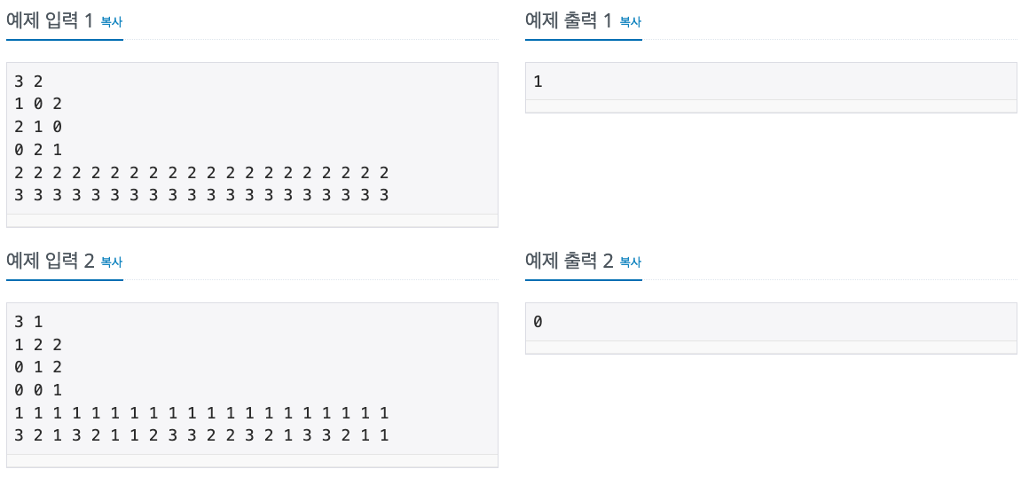 그 다음 N개의 줄에 대해 상성에 대한 정보 Ai,j가 주어진다. i+1번째 줄에는 N개의 정수 Ai,1, Ai,2, Ai,3, ..., Ai,N이 한 칸의 빈칸을 사이에 두고 주어진다. Ai,j가 2일 경우에는 i번 손동작이 j번 손동작을 이긴다는 의미이고, 1일 경우에는 비긴다는 의미이고, 0일 경우에는 진다는 의미이다. Ai,i = 1이고, i ≠ j일 때 Ai,j ≠ 1임이 보장된다. 또한 Ai,j가 2일 경우에는 Aj,i가 0이고, Ai,j가 0일 경우에는 Aj,i가 2임이 보장된다.