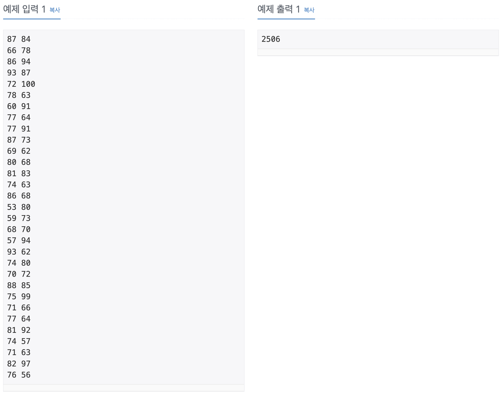 입력은 각 플레이어들의 능력치로 이루어진다. 각 줄은 공백으로 구분되는 두 개의 정수로 주어진다. 첫 번째 숫자는 해당 플레이어가 백으로 플레이를 할 때 능력치고 두 번째 숫자는 흑으로 플레이를 할 때의 능력치다. 최소한 30줄 이상이며 1000줄은 넘지 않는다.