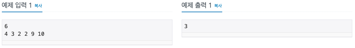 첫째 줄에는 자연수의 개수 N이 입력된다. N은 1 이상 20,000 이하이다. 둘째 줄에는 N개의 자연수가 빈칸을 사이에 두고 입력되며, 이 수들은 모두 1 이상 10,000 이하이다.