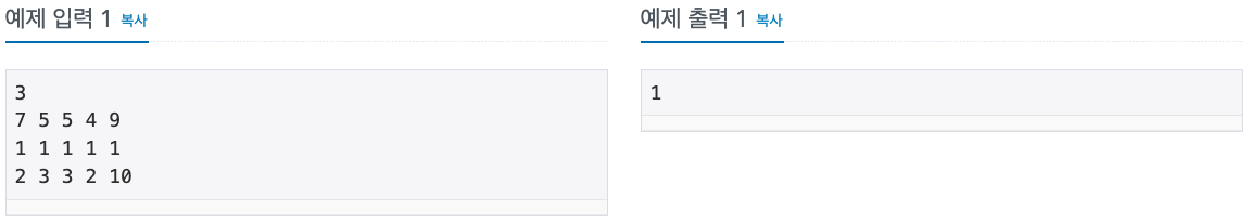 첫 줄에는 사람의 수를 나타내는 정수 N이 주어진다. N은 2이상 1,000이하이다. 그 다음 N 줄에는 1번부터 N번까지 각 사람이 가진 카드가 주어지는 데, 각 줄에는 1부터 10사이의 정수가 다섯 개씩 주어진다. 각 정수 사이에는 한 개의 빈칸이 있다.
