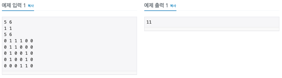 - 행렬은 0과 1로만 이루어져 있고, 0이 빈 칸, 1이 벽이다.