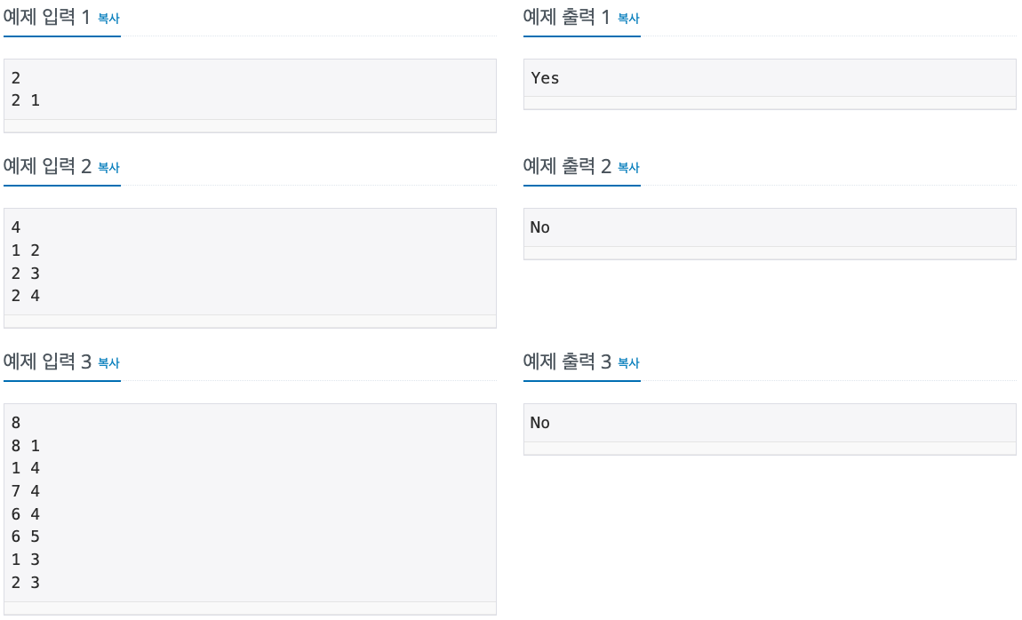 둘째 줄부터 N-1줄에 걸쳐 트리의 간선 정보가 주어진다. 줄마다 두개의 자연수 a, b(1 ≤ a, b ≤ N, a ≠ b)가 주어지는데, 이는 a와 b 사이에 간선이 존재한다는 뜻이다.