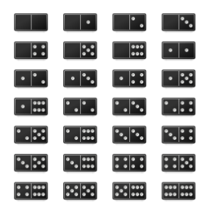 도미노의 크기는 1×2이고, 크기가 1×1인 칸으로 나누어져 있다. 칸은 수를 나타내며, 위와 같이 총 28가지가 있다.
