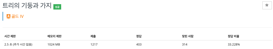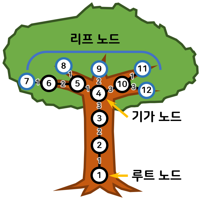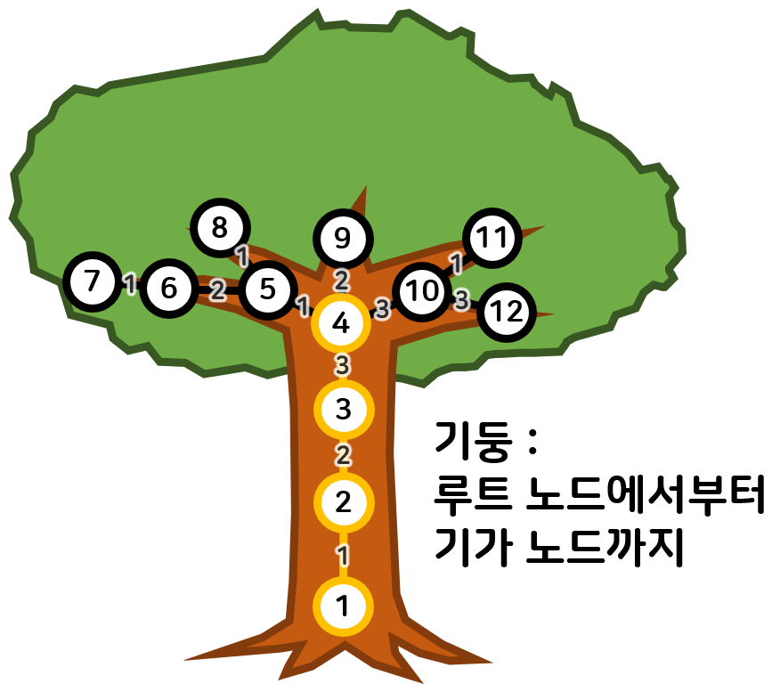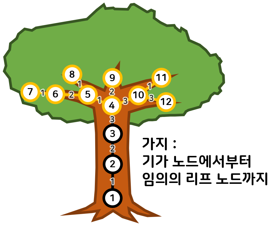 기둥의 길이는 기둥의 간선 길이의 합인 1+2+3=6 이 된다. - 트리의 가지는 기가 노드에서부터 임의의 리프 노드까지다. 위 그림에서 가지는 4−5−6−7, 4−5−8, 4−9, 4−10−11, 4−10−12 총 5개가 있다.