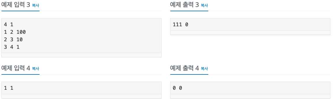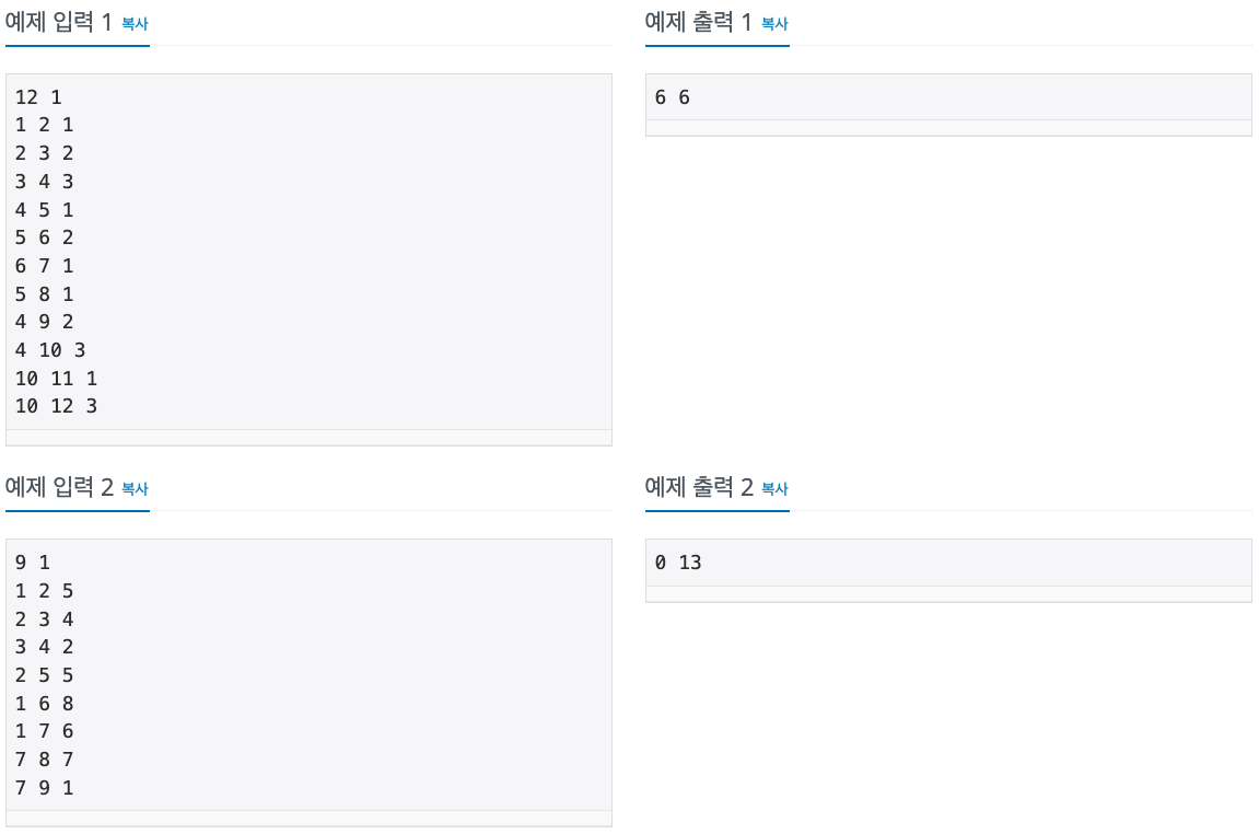 첫 번째 줄에는 노드의 개수 $N$($1 \le N \le 200\,000$)과 루트 노드의 번호 $R$($1 \le R \le N$)이 주어진다. 이후 $N-1$개의 줄에 세 개의 정수 $a$, $b$, $d$($1 \le a, b \le N$, $ a \ne b$)가 주어진다. 이는 $a$번