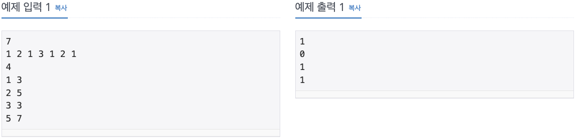 각 질문은 두 정수 S와 E(1 ≤ S ≤ E ≤ N)로 나타낼 수 있으며, S번째 수부터 E번째 까지 수가 팰린드롬을 이루는지를 물어보며, 명우는 각 질문에 대해 팰린드롬이다 또는 아니다를 말해야 한다.