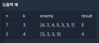 - 모든 라운드를 막을 수 있는 경우에는 enemy[i]의 길이를 return 해주세요.