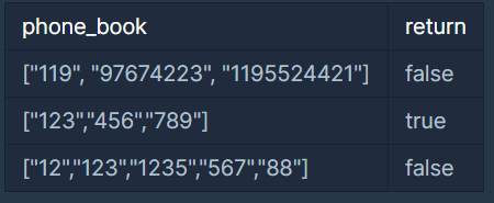첫 번째 전화번호, “12”가 두 번째 전화번호 “123”의 접두사입니다. 따라서 답은 false입니다.
