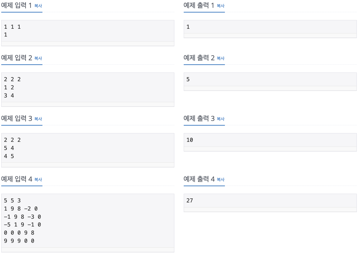 첫째 줄에 N, M, K가 주어진다. 둘째 줄부터 N개의 줄에 격자판에 들어있는 수가 주어진다.