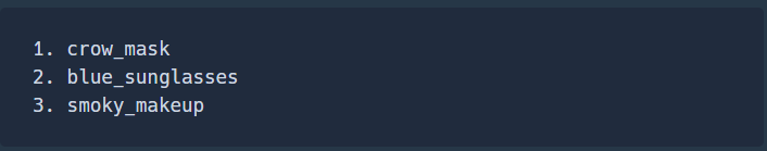 face에 해당하는 의상이 crow_mask, blue_sunglasses, smoky_makeup이므로 아래와 같이 3개의 조합이 가능합니다.