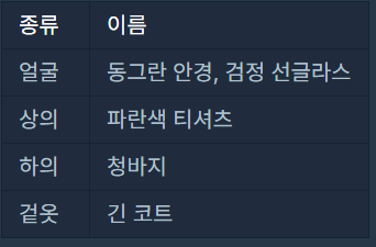 - clothes의 각 행은 [의상의 이름, 의상의 종류]로 이루어져 있습니다.