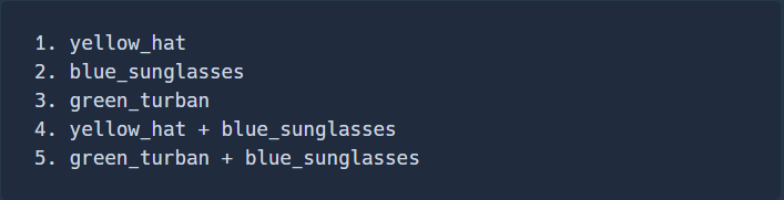 headgear에 해당하는 의상이 yellow_hat, green_turban이고 eyewear에 해당하는 의상이 blue_sunglasses이므로 아래와 같이 5개의 조합이 가능합니다.