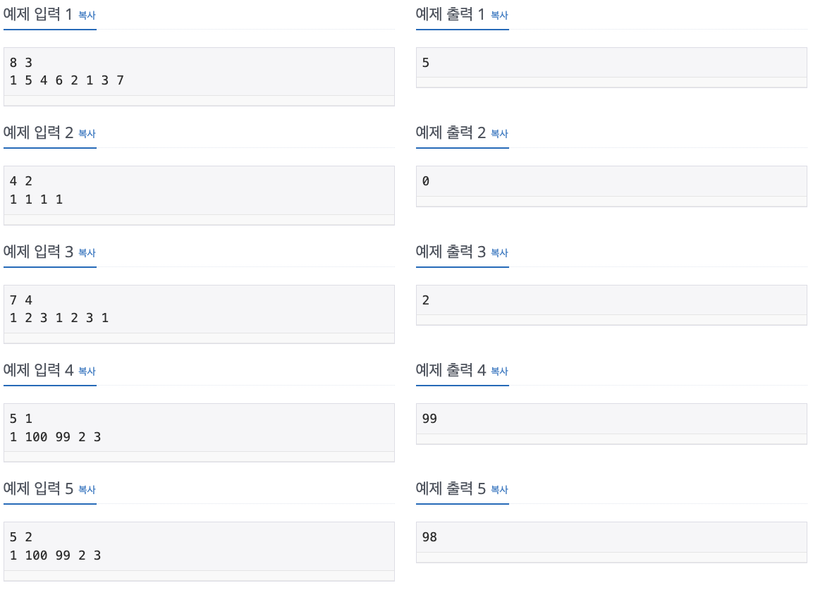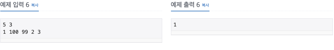 첫째 줄에 배열의 크기 N과 M이 주어진다. (1 ≤ N ≤ 5,000, 1 ≤ M ≤ N) 둘째 줄에 배열에 들어있는 수가 순서대로 주어진다. 배열에 들어있는 수는 1보다 크거나 같고, 10,000보다 작거나 같은 자연수