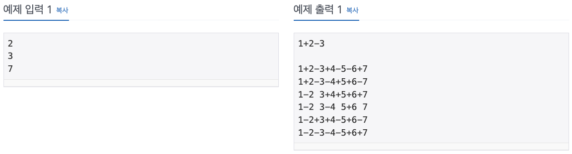 이제 연산자들의 순열과 1부터 N까지의 숫자를 이용해 0이 되는지 계산하고, 0이 된다면 그 계산 식을 출력하면 된다.