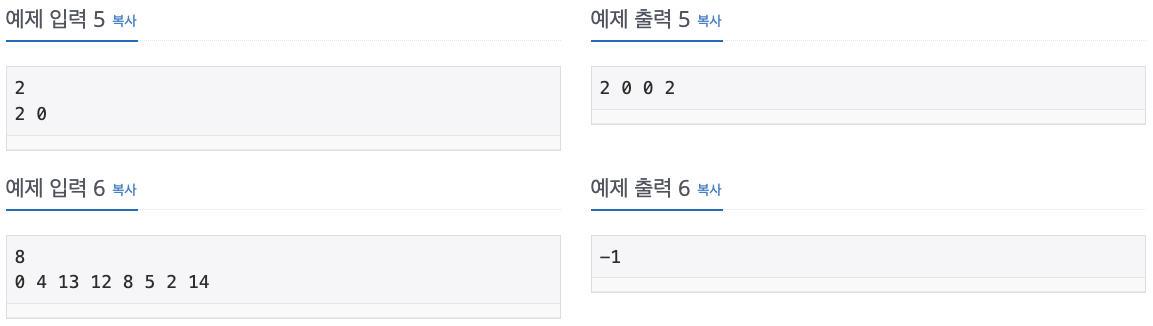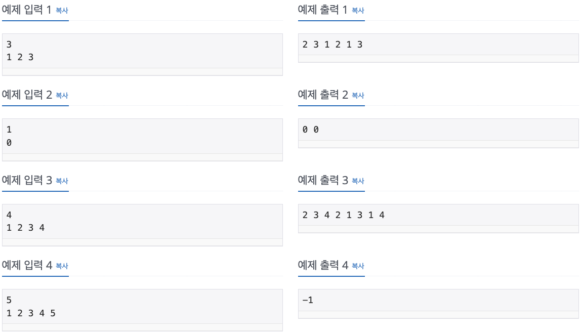 첫째 줄에 숌 사이 수열을 출력한다. 만약 여러 개일 경우 사전 순으로 가장 빠른 것을 출력한다. 만약 없을 경우에는 -1을 출력한다.