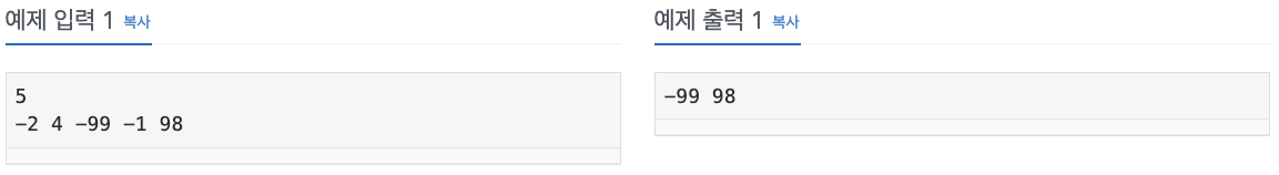 첫째 줄에 특성값이 0에 가장 가까운 용액을 만들어내는 두 용액의 특성값을 출력한다. 출력해야 하는 두 용액은 특성값의 오름차순으로 출력한다. 특성값이 0에 가장 가까운 용액을 만들어내는 경우가 두 개 이상일 경우에는 그 중 아무것이나 하나를 출력한다.