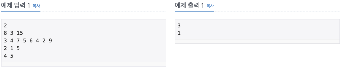 입력 데이터는 표준 입력을 사용한다. 입력은 T개의 테스트 데이터로 구성된다. 입력의 첫째 줄에 테스트 케이스의 개수를 나타내는 자연수 T가 주어진다. 각각의 테스트 케이스의 첫째 줄에 마
