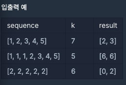 수열을 나타내는 정수 배열 sequence와 부분 수열의 합을 나타내는 정수 k가 매개변수로 주어질 때, 위 조건을 만족하는 부분 수열의 시작 인덱스와 마지막 인덱스를 배열에 담아 return 하는 solution 함수를 완성해주세요. 이때 수열의 인덱스는 0부터 시작합니다.