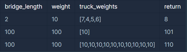 solution 함수의 매개변수로 다리에 올라갈 수 있는 트럭 수 bridge_length, 다리가 견딜 수 있는 무게 weight, 트럭 별 무게 truck_weights가 주어집니다. 이때 모든 트럭이 다리를 건너려면 최소 몇 초가 걸리는지 return 하도록 solution 함수를 완성하세요.