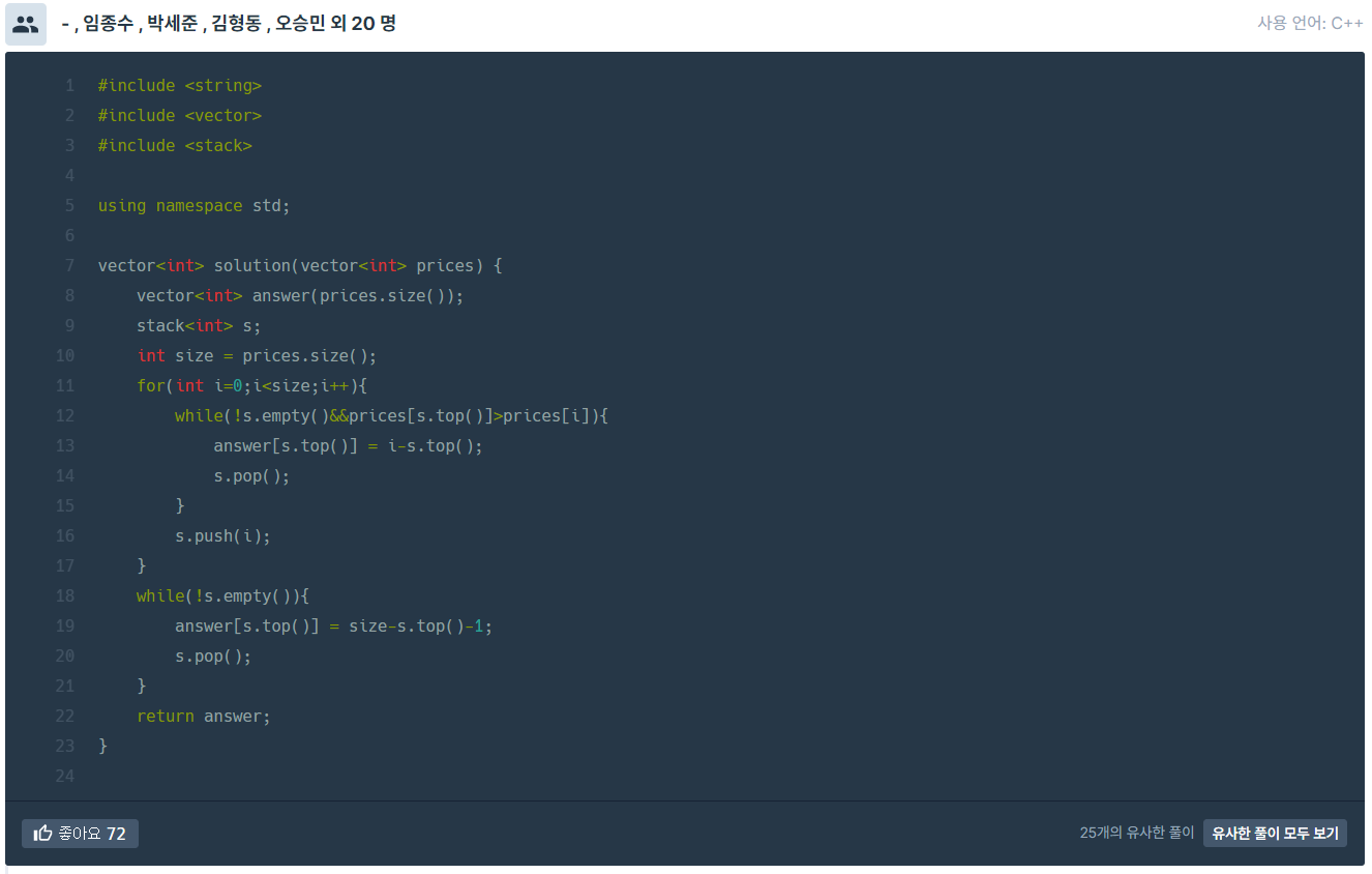 테스트케이스의 크기가 10000이하이기 때문에 2중 for문을 풀어도 통과 가능한 문제지만,그래도 스택/큐로 풀으라고 분류되어 있는 문제였기에 아래 스택으로 푸신 분의 코드도 첨부한다.스택으로 짠 풀이는 시간 복잡도가 O(N)에 가깝고내가 짠 2중 for문 풀이는 O(N^2)에 가깝다.