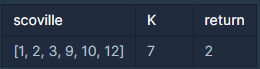 - 모든 음식의 스코빌 지수를 K 이상으로 만들 수 없는 경우에는 -1을 return 합니다.