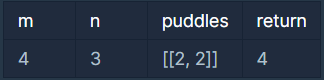 int solution(int m, int n, vector<vector<int>> puddles) {