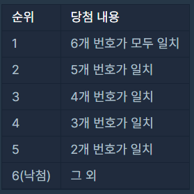 - 순서와 상관없이, 구매한 로또에 당첨 번호와 일치하는 번호가 있으면 맞힌 걸로 인정됩니다.