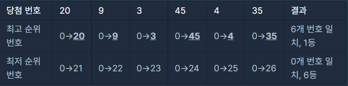 - win_nums의 모든 원소는 1 이상 45 이하인 정수입니다.