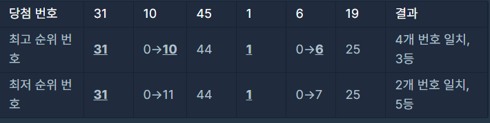 알아볼 수 없는 번호를 0으로 표기하기로 하고, 민우가 구매한 로또 번호 6개가 44, 1, 0, 0, 31 25라고 가정해보겠습니다. 당첨 번호 6개가 31, 10, 45, 1, 6, 19라면, 당첨 가능한 최고 순위와 최저 순위의 한 예는 아래와 같습니다.