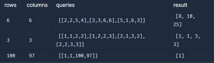 - 1 ≤ x1 < x2 ≤ rows, 1 ≤ y1 < y2 ≤ columns입니다.