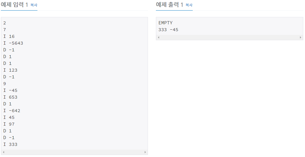 출력은 표준출력을 사용한다. 각 테스트 데이터에 대해, 모든 연산을 처리한 후 Q에 남아 있는 값 중 최댓값과 최솟값을 출력하라. 두 값은 한 줄에 출력하되 하나의 공백으로 구분하라. 만약 Q가 비어있다면 ‘EMPTY’를 출력하라.
