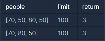 - 구명보트의 무게 제한은 항상 사람들의 몸무게 중 최댓값보다 크게 주어지므로 사람들을 구출할 수 없는 경우는 없습니다.