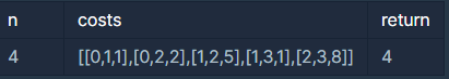 - 임의의 i에 대해, costs[i][0] 와 costs[i] [1]에는 다리가 연결되는 두 섬의 번호가 들어있고, costs[i] [2]에는 이 두 섬을 연결하는 다리를 건설할 때 드는 비용입니다.