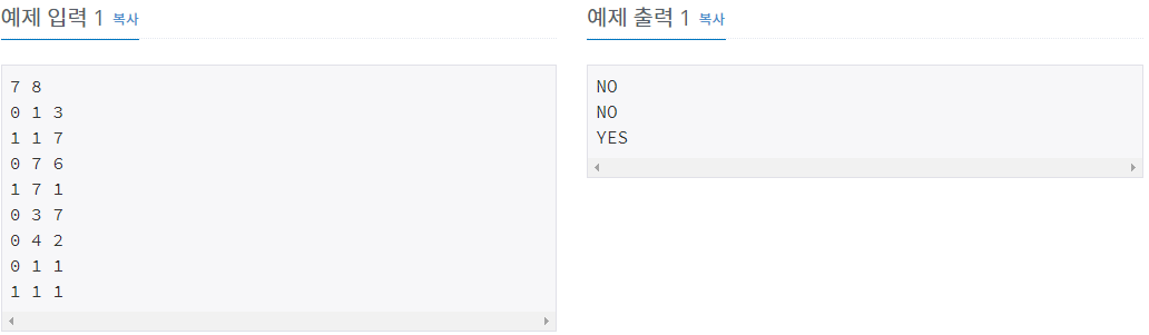 첫째 줄에 n(1 ≤ n ≤ 1,000,000), m(1 ≤ m ≤ 100,000)이 주어진다. m은 입력으로 주어지는 연산의 개수이다. 다음 m개의 줄에는 각각의 연산이 주어진다. 합집합은 0 a b의 형태로 입력이 주어진다. 이는 a가 포함되어 있는 집합과, b가 포함되어 있는 집합을 합친다는 의미이다. 두 원소가 같은 집합에 포함되어 있는지를 확인하는 연산은 1 a b의 형태로 입력이 주어진다. 이는 a와 b가 같은 집합에 포함되어 있는지를 확인하는 연산이다. a와 b는 n 이하의 자연수 또는 0이며 같을 수도 있다.