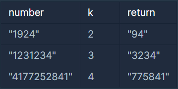 문자열 형식으로 숫자 number와 제거할 수의 개수 k가 solution 함수의 매개변수로 주어집니다. number에서 k 개의 수를 제거했을 때 만들 수 있는 수 중 가장 큰 숫자를 문자열 형태로 return 하도록 solution 함수를 완성하세요.